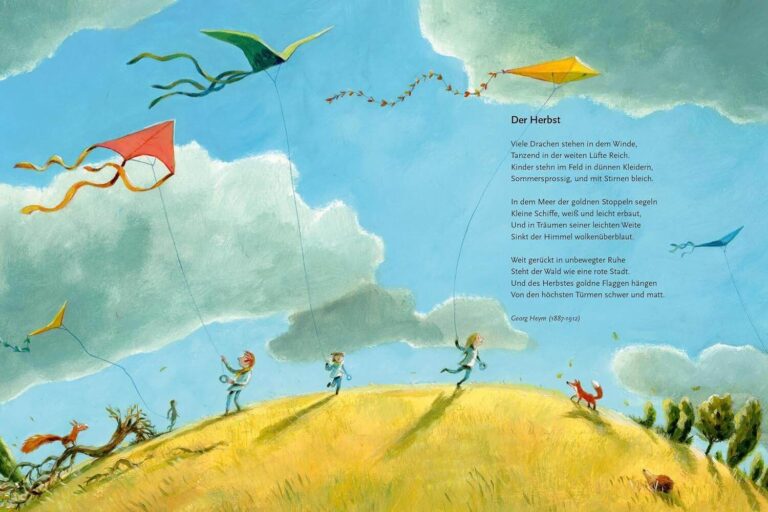 Da passt das wunderbare Bilderbuch "Blätter fallen – Die schönsten Herbstgedichte" (Anzeige)* perfekt. Hier werden herbstliche Verse in Szene gesetzt und mit Hilfe von farbenfrohen Illustrationen präsentiert. Dabei finden wir berühmte Gedichte wie das obige von Rilke, oder auch von Johann Wolfgang von Goethe und Theodor Fontane. Zudem sind Georg Trakl, Luise Hensel, August Heinrich Hoffmann von Fallersleben, Selma Meerbaum-Eisinger, Georg Heym, Clara Müller-Jahnke sowie Friedrich Hebbel vertreten.