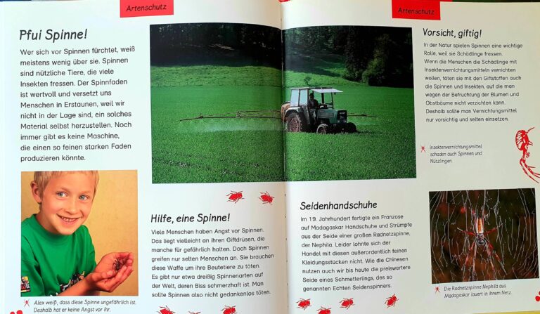 In kindgerechten, kurzen und klaren Texten erfahren wir am Beispiel der Wespenspinne etwas über ihr magisches Netz, in dem sie wohnt und gleichzeitig auf Jagd geht, über ihren Nachwuchs aber auch über ihre Fressfeinde. Außerdem gibt es interessante Einblicke in das Leben und Verhalten anderer Spinnen auf der ganzen Welt.