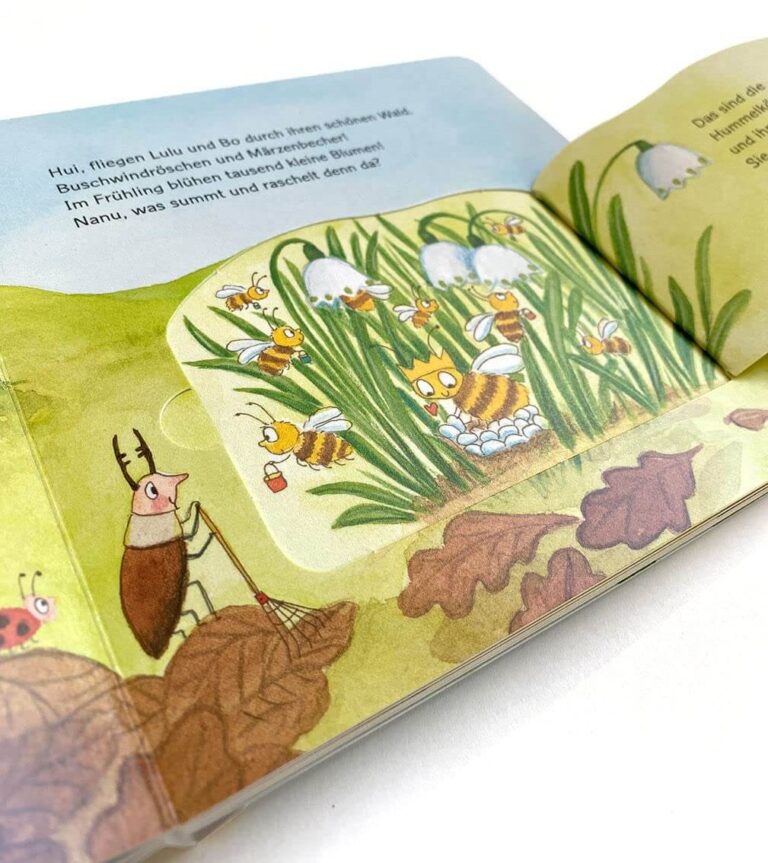 So geht es auf jeden Fall der kleinen Baumelfe Lulu. Sie freut sich schon ganz gewaltig auf den Frühling. Gemeinsam mit ihrem Freund Bo möchte sie das Erwachen der Natur erleben. Doch sie kann Bo nicht finden! Hat er den Frühlingsbeginn etwa verschlafen? Lulu weckt ihren Freund auf und zusammen helfen sie Herrn und Frau Meise beim Nestbau. Anschließend entdecken sie die Frühblüher im Wald und treffen auf fleißige Hummeln. Nach einem kurzen Versteckspiel mit den kleinen Füchsen, gibt es noch köstlichen Kuchen bei Familie Kaninchen. Zum Schluss helfen Lulu und Bo den Vogelkindern beim Fliegenlernen. Ach, wie schön ist doch die Frühlingszeit!